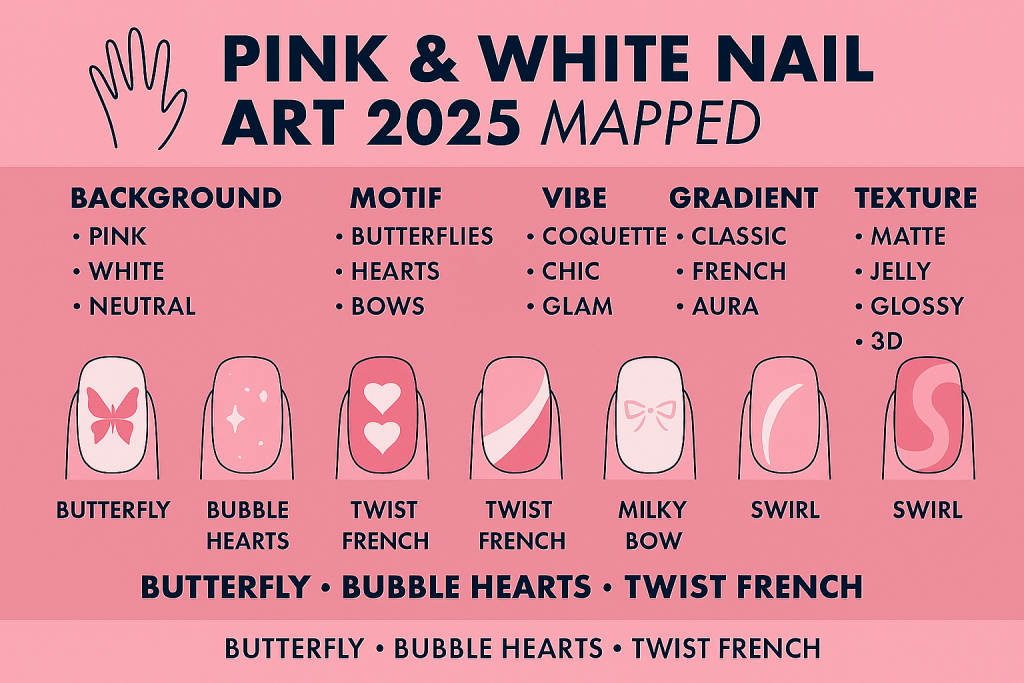 💅 Pink & White Nail Art Designs 2025: Mapped by Motif, Finish, Shape & Style